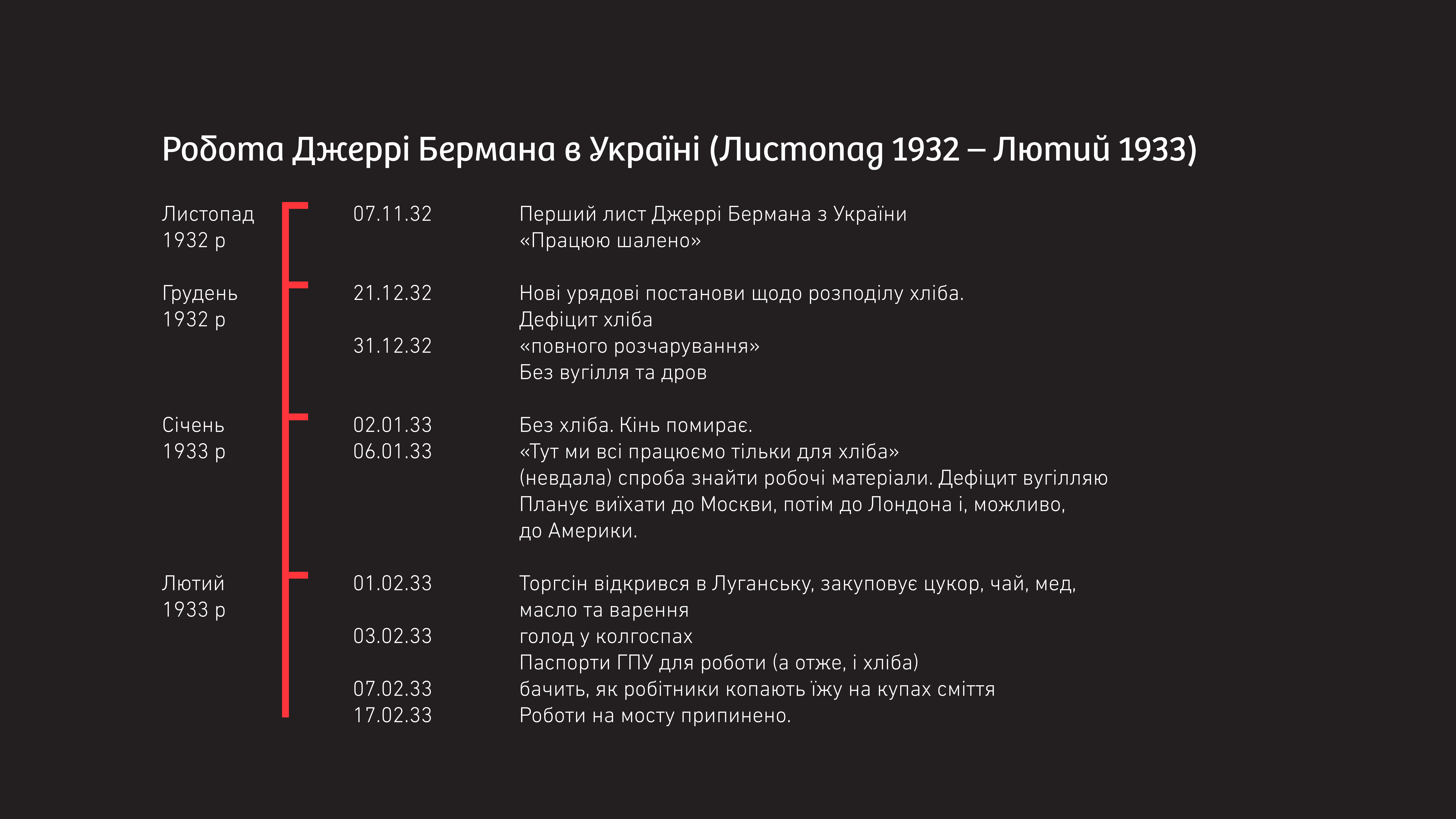 A timeline of Jerry Berman’s work in Ukraine Nov 1932–Feb 1933.